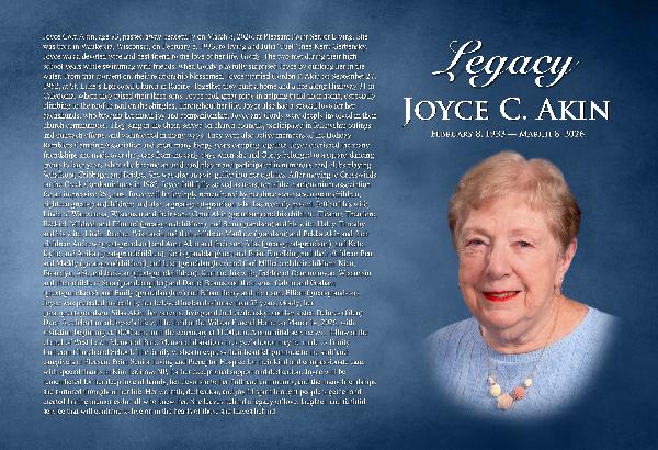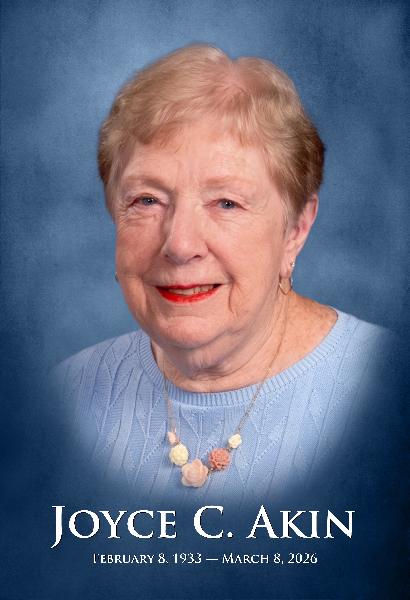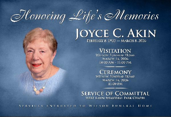 Legacy Obituary changed from Joyce Cora Akin, age 93, passed away peacefully on March 8, 2026, at Pleasant Point Senior Living. She was born in Waukesha, Wisconsin, on February 8, 1933, to Irving and Julia “Juel” (née Kerr) Gerbensky. Joyce was a devoted wife and best friend to the love of her life, Gordy. The two met during their high school years while swimming with friends, when Gordy playfully surprised Joyce by dunking her in the water. From that moment on, their relationship blossomed. Joyce married Gordon F. Akin on September 27, 1952, at St. Luke’s Episcopal Church in Racine. Together they built a home and a life along Highway 31 in Caledonia, where they raised their three sons. Joyce took great pride in helping build their home, especially climbing to the roof to nail on the shingles. Throughout her life, Joyce also had a special love for her dachshunds, who brought her much joy and companionship. Joyce and Gordy were deeply involved in their church communities. They sang in the choir, served on church councils, participated in fellowship outings and outreach efforts, and volunteered in many ways. They were also active members of the Holiday Ramblers Camping Association and spent many happy years camping together. Joyce cherished the many friendships she made over the years from the early days when she and Gordy belonged to a square-dancing group to later years when she became an avid card player and participated in numerous card clubs playing Schafkopt, Cribbage, and Bridge. She was also an avid golfer into her eighties. After moving to Crosswinds on the Creek Condominiums in 1987, Joyce faithfully served as treasurer of the condominium association for an impressive 36 years. Joyce will be lovingly remembered by her three sons; seven grandchildren; eighteen great-grandchildren; and also, a great-great-grandson who has recently passed. Jeff and his wife, Linda of Wauwatosa, Wisconsin and their sons: Grant Akin (grandson) and his children: Eleanor, Theodore, Ezekiel, Mildred, and Edmund (great-grandchildren), and Sean (grandson) and his wife, Haley. Timothy and his wife, Linda, Racine, Wisconsin and their children; Matthew (grandson) and Bekka Akin and their children: Andrew (great-grandson) and Anna Akin and their son, Silas (great-great-grandson), and Kate, Kylie, and Anika (great-grandchildren), Keri (granddaughter) and Brian Engelking and their children: Ben and Maddy (great-grandchildren), and Lisa (granddaughter) and Carl Miller and their children: Nico, Brooklyn, Abi, and Jackson (great-grandchildren). Kurt and his wife, Debbie of Oconomowoc, Wisconsin and their children; Sara (granddaughter) and Daniel Beams and their sons: Calvin and Graham (great-grandsons), and Emily (granddaughter) and Ethan Henry and their son, Elliott (great-grandson). Joyce was preceded in death by her beloved husband of more than 53 years, Gordy; her great-great-grandson, Silas Akin; her parents, Irving and Juel Gerbensky; and her sister, Delores (Glen) Dyer. A celebration of Joyce’s life will be held at the Wilson Funeral Home on March 14, 2026, with visitation beginning at 10:00 a.m. until the ceremony at 11:00 a.m. A committal service will follow at the chapel of West Lawn Memorial Park. Memorial donations in Joyce’s honor may be made to Trinity Lutheran Church and School. The family wishes to express their heartfelt gratitude to the staff and caregivers at Pleasant Point Senior Living and Preceptor Hospice for their kind and compassionate care, with special thanks to Kim LaGrow, NP, for her exceptional support and dedication. Joyce will be remembered for her deep love of family, her devotion to her faith and community, and the many friendships she nurtured throughout her life. Her warmth, dedication, and joyful spirit brought people together and created lasting memories for all who knew her. She leaves behind a legacy of love, laughter, and faithful service that will continue to live on in the hearts of those she leaves behind. to Joyce Cora Akin, age 93, passed away peacefully on March 8, 2026, at Pleasant Point Senior Living. She was born in Waukesha, Wisconsin, on February 8, 1933, to Irving and Julia “Juel” (née Kerr) Gerbensky. Joyce was a devoted wife and best friend to the love of her life, Gordy. The two met during their high school years while swimming with friends, when Gordy playfully surprised Joyce by dunking her in the water. From that moment on, their relationship blossomed. Joyce married Gordon F. Akin on September 27, 1952, at St. Luke’s Episcopal Church in Racine. Together they built a home and a life along Highway 31 in Caledonia, where they raised their three sons. Joyce took great pride in helping build their home, especially climbing to the roof to nail on the shingles. Throughout her life, Joyce also had a special love for her dachshunds, who brought her much joy and companionship. Joyce and Gordy were deeply involved in their church communities. They sang in the choir, served on church councils, participated in fellowship outings and outreach efforts, and volunteered in many ways. They were also active members of the Holiday Ramblers Camping Association and spent many happy years camping together. Joyce cherished the many friendships she made over the years from the early days when she and Gordy belonged to a square-dancing group to later years when she became an avid card player and participated in numerous card clubs playing Schafkopt, Cribbage, and Bridge. She was also an avid golfer into her eighties. After moving to Crosswinds on the Creek Condominiums in 1987, Joyce faithfully served as treasurer of the condominium association for an impressive 36 years. Joyce will be lovingly remembered by her three sons; seven grandchildren; eighteen great-grandchildren; and also, a great-great-grandson who has recently passed. Jeff and his wife, Linda of Wauwatosa, Wisconsin and their sons: Grant Akin (grandson) and his children: Eleanor, Theodore, Ezekiel, Mi